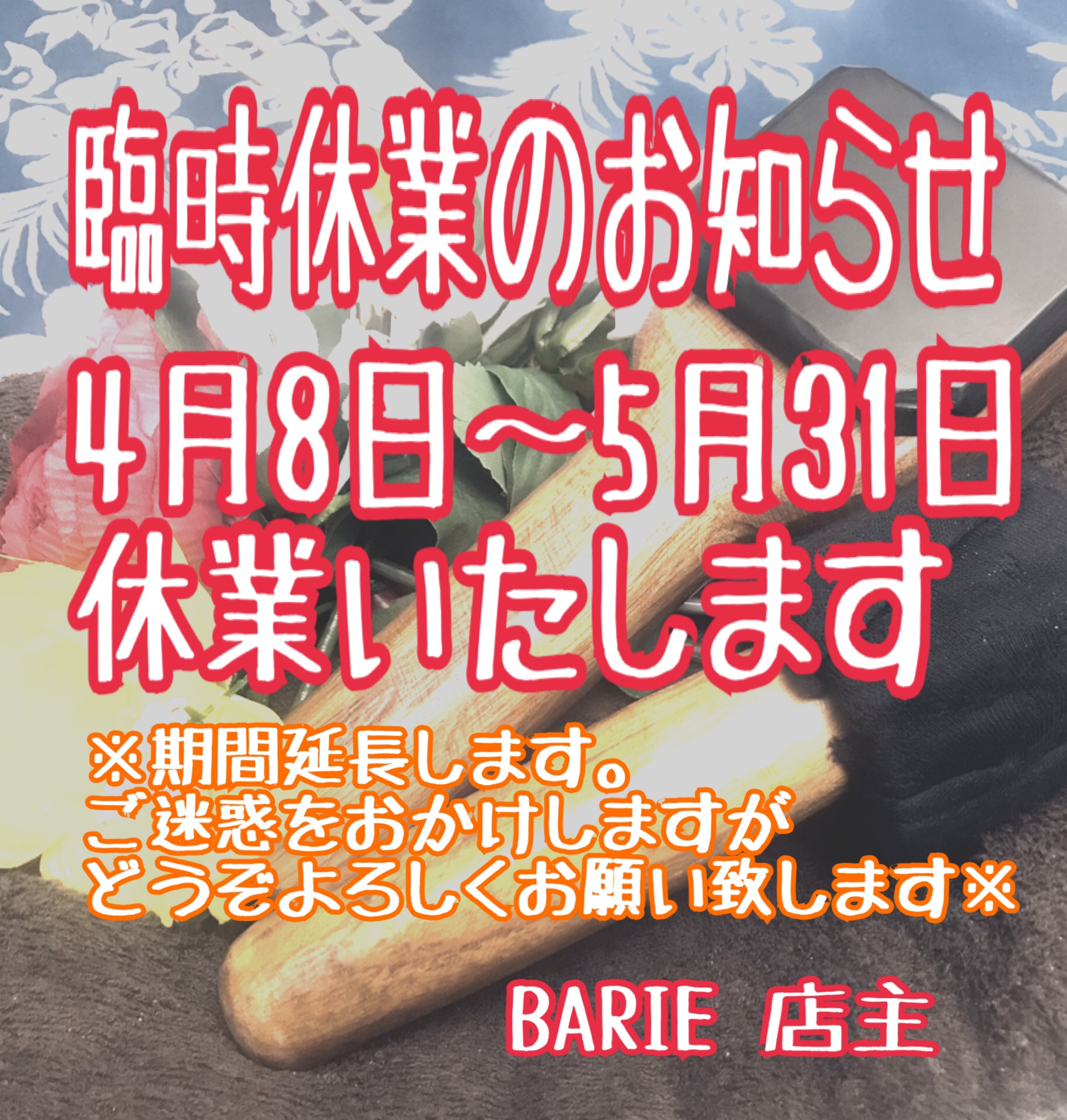 2020年5月4日 / 最終更新日時 : 2020年5月4日 barie3 お知らせ《大事なお知らせ・臨時休業》 期間が変更になりましたので、あらためまして臨時休業期間のお知らせです。 緊急事態宣言受けまして、新型コロナ拡大防止、皆様の安全の為に臨時休業をいたします。ご迷惑ご不便をおかけしますが、どうぞよろしくお願いいたしますm(_ […]